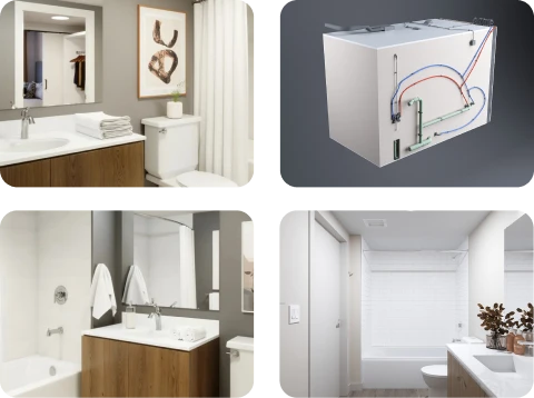 Bathrooms arrive fully finished with plumbing, electrical, and high-quality finishes in place—factory-built under precise quality controls to ensure faster installation, consistent results, and cost certainty for multifamily, hospitality, and extended-stay projects.