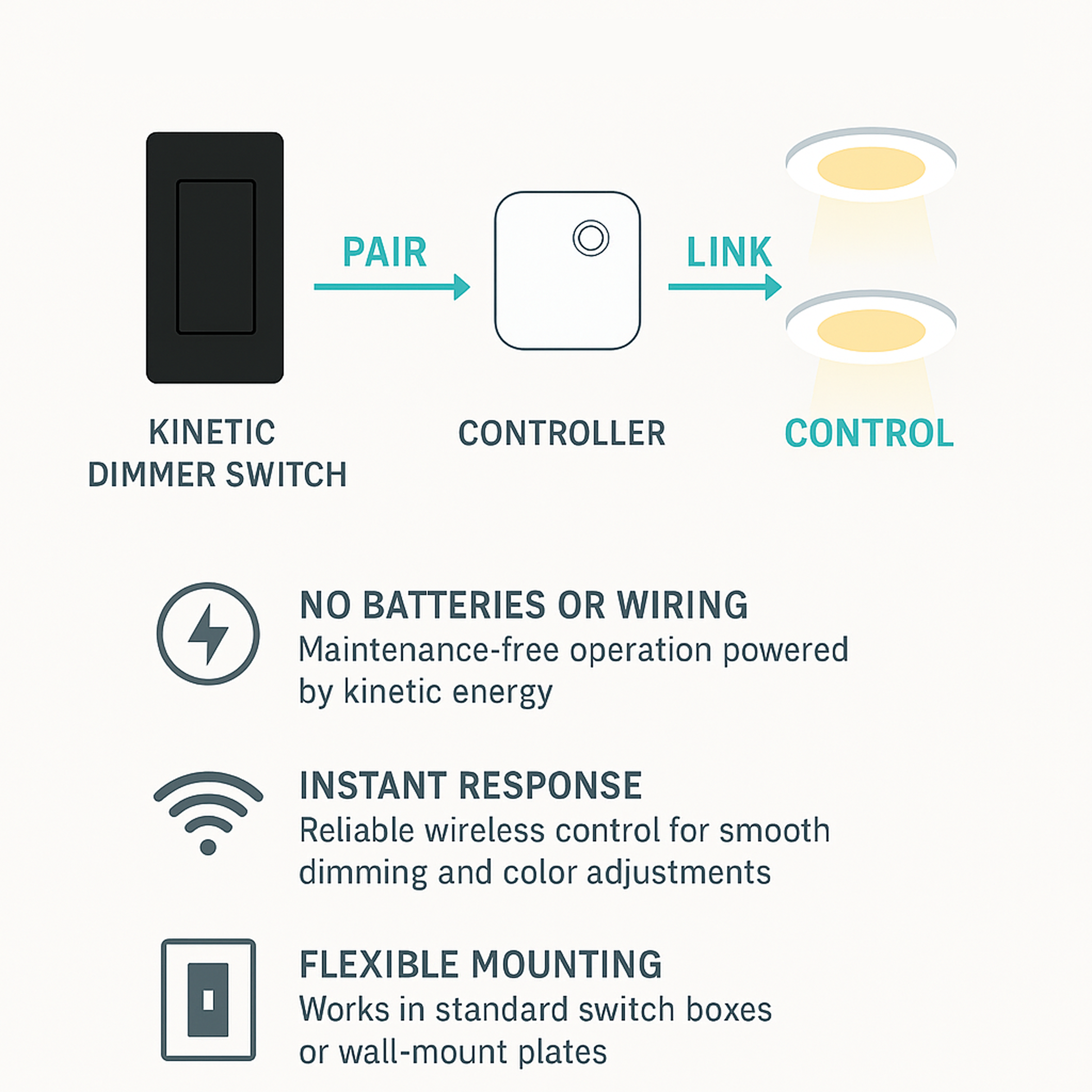Wireless, battery-free switches that generate power through motion. With no wiring required, they can be installed anywhere, offering flexible, maintenance-free lighting control