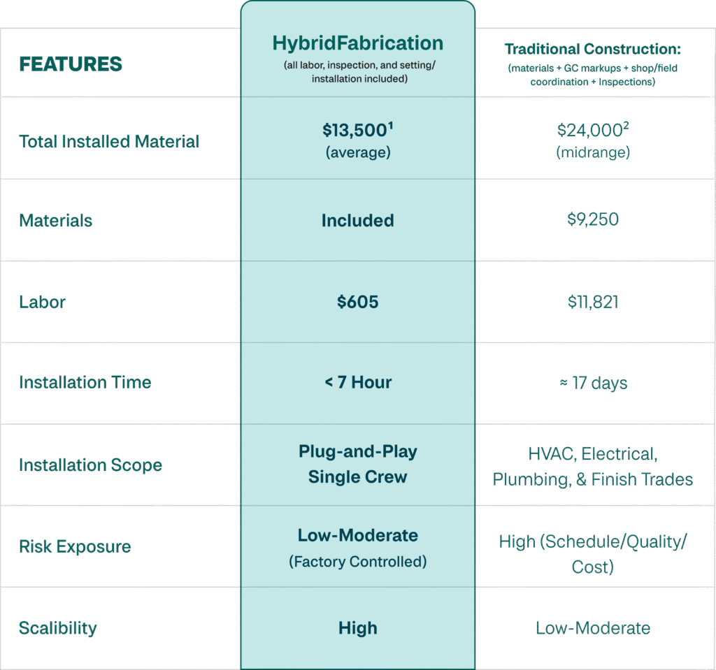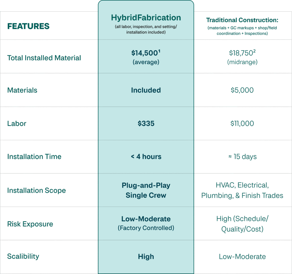 Resia looked at three common decision points: bathrooms, kitchens, and power infrastructure. For each, we compared a traditional site-built approach with Resia’s prefabricated method and summarized where time, labor, and risk shift when work moves to the factory. The snapshots below mirror our estimating view and field lessons learned.
