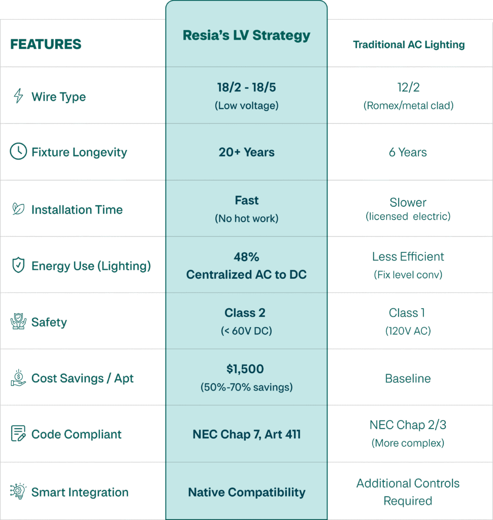 What changes: Centralized low-voltage distribution and plug-in devices vs. distributed line-voltage terminations.